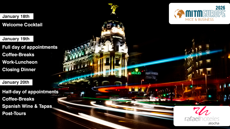 The oldest international MICE B2B tradeshow in Europe returns to Madrid, from the 18th to the 20th of January, 2026, at Rafaelhoteles Atocha, host hotel and official sponsor of the event.